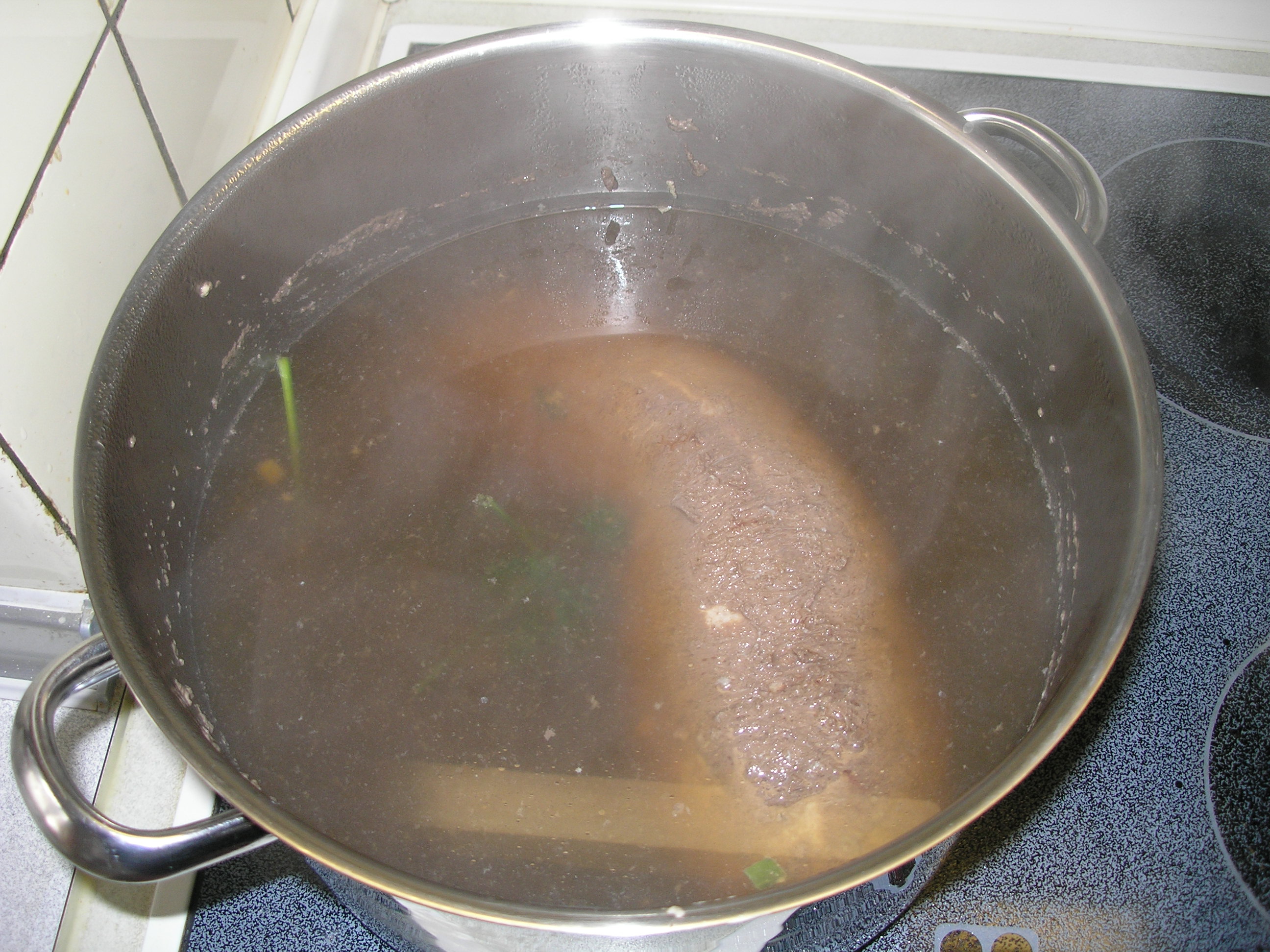 etwa 1 1/2 -- 2 Stunden gargekocht (nicht sprudelnd). In Scheiben