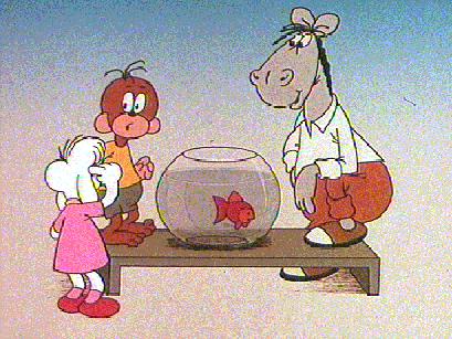 Schlabbinchen: "Verschreck'n doch net, sonscht schwimmt'r auf und davon, du Dackel!"